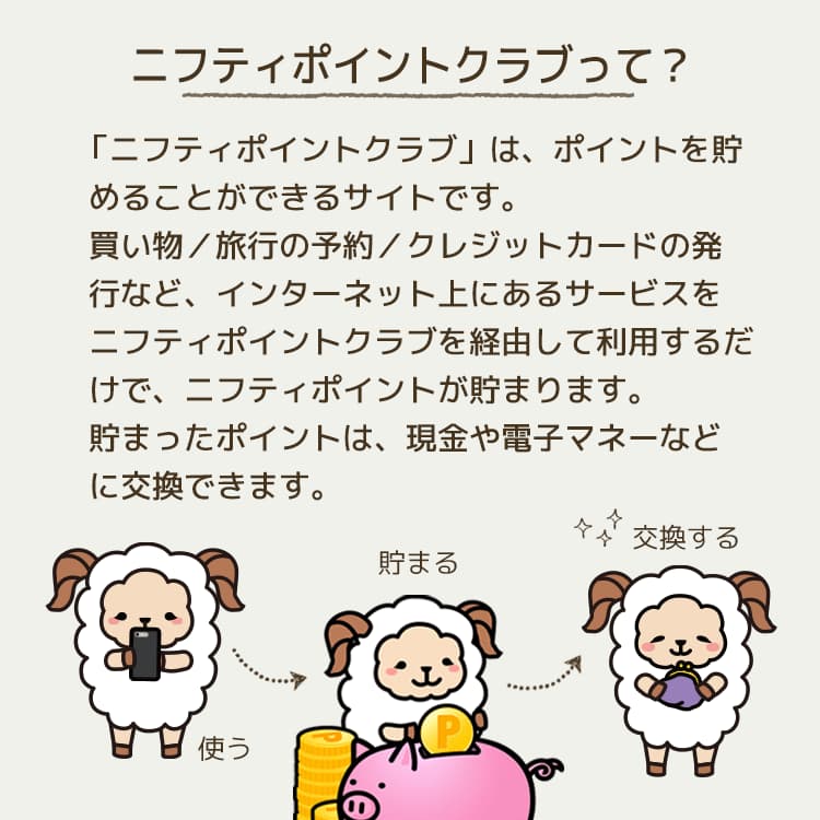 • ニフティポイントクラブから申し込む際、ポイント獲得条件を満たすこと。広告掲載ページに記載のポイント獲得条件の説明と、よくある質問・お問い合わせページの「【重要】ポイント獲得のために必ず確認すること」は必読です。ひとつでも条件に該当しないと、ポイントはもらえません。